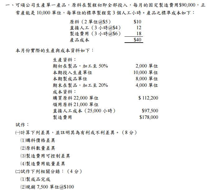 這題主要不懂製造費用的能量差跟可控制差異分析