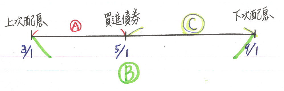 買方要先給賣方3/1~5/1之間的利息(3/1~5/1,上次配息日~購入日,A區間),